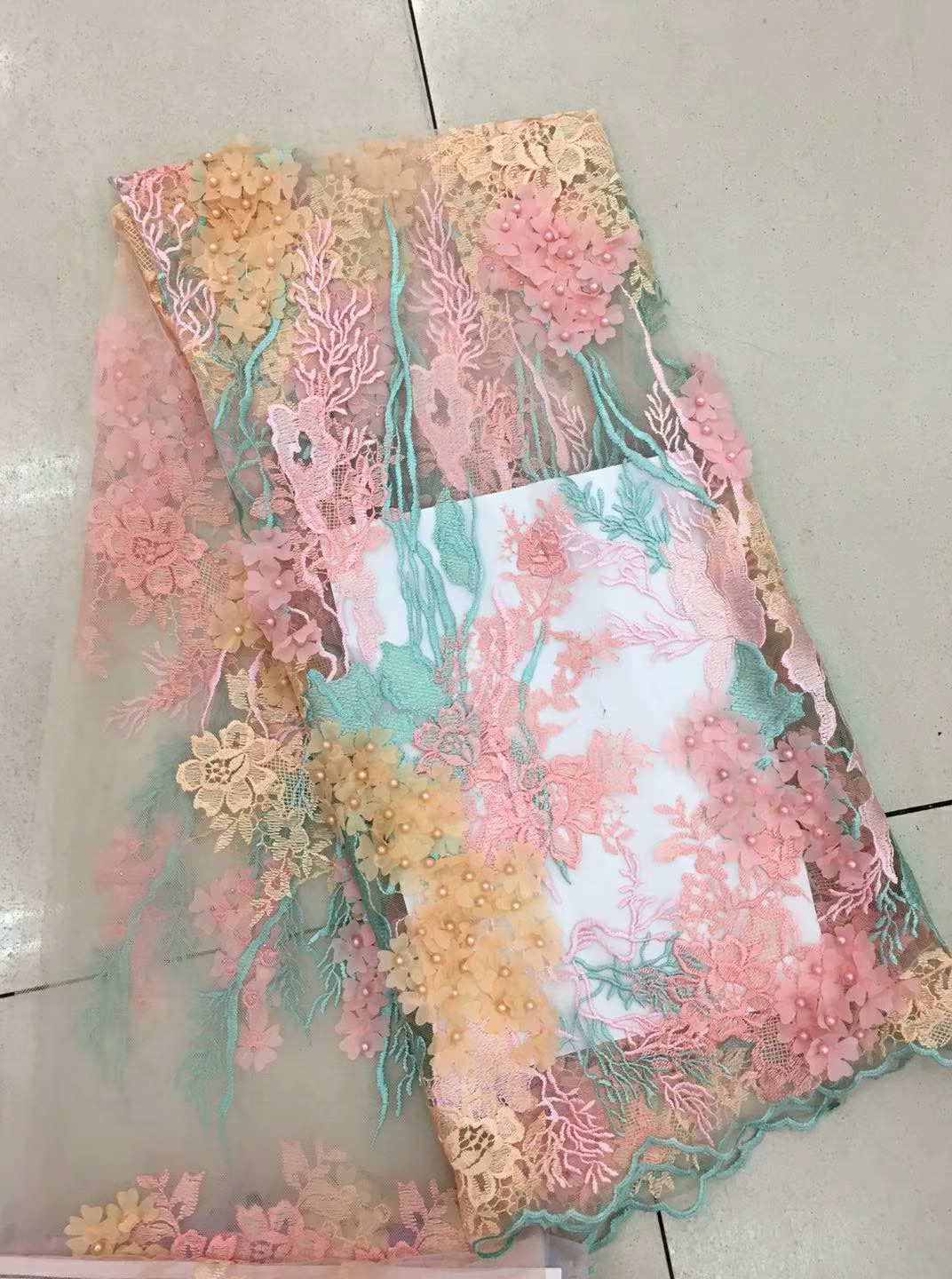 نسيج دانتيل مطرز ثلاثي الأبعاد، قماش مطرز بالزهور متعدد الألوان للتنانيرمواد طبيعية مختارة وخالية من التلوث وعالية الجودة