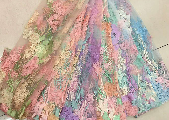 نسيج دانتيل مطرز ثلاثي الأبعاد، قماش مطرز بالزهور متعدد الألوان للتنورة
